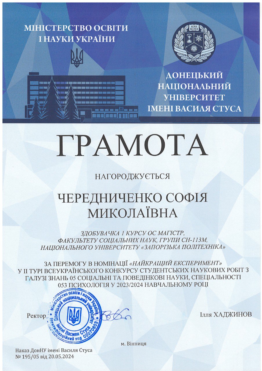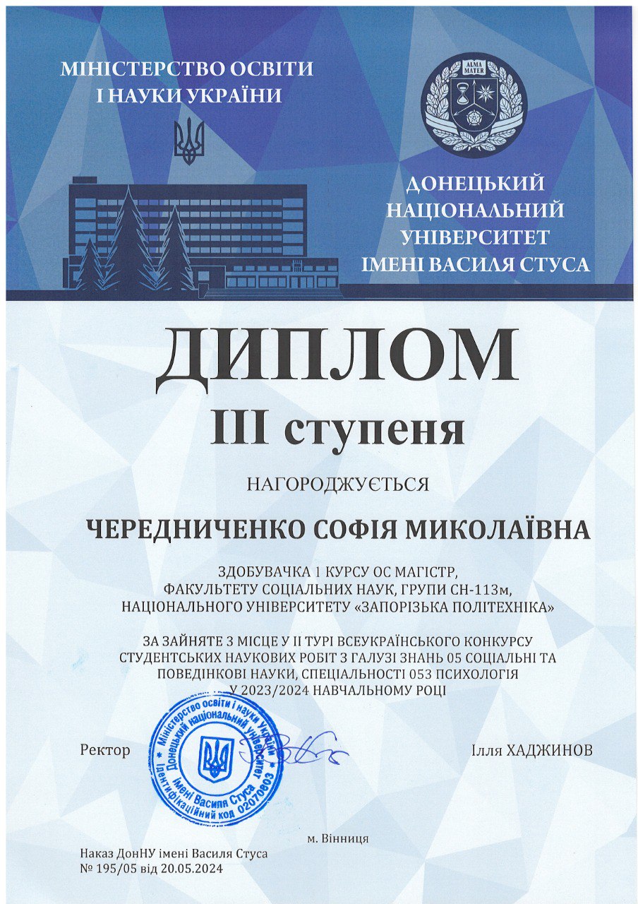 - Софія Чередниченко, СН-113м, робота «Психологічні особливості тривожності студентів під час навчання у закладі вищої освіти» (наукова керівниця — доцентка кафедри психології Марина Хрустальова).