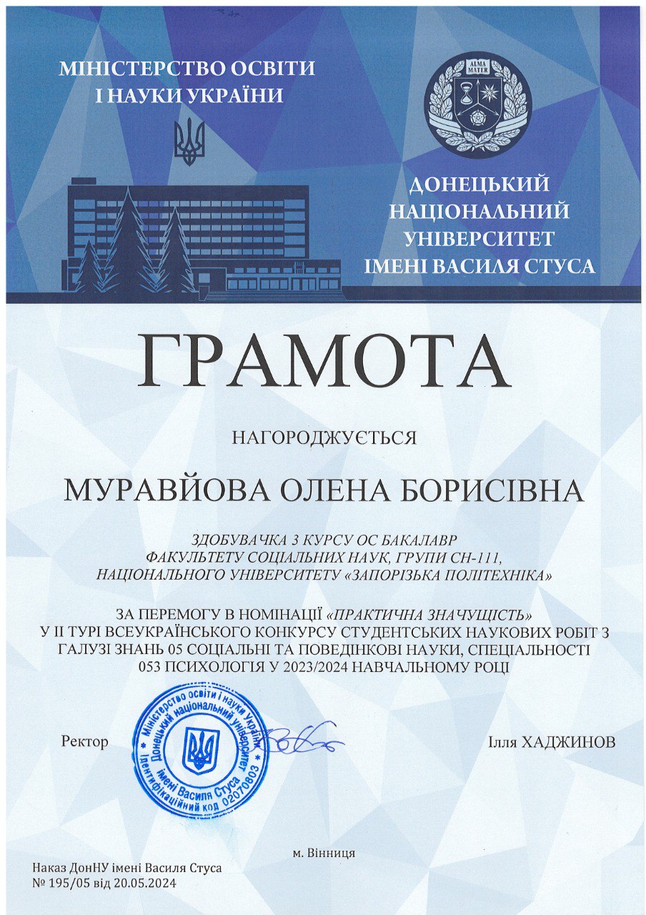 - Олена Муравйова здобула грамоту у номінації «Практична значущість».