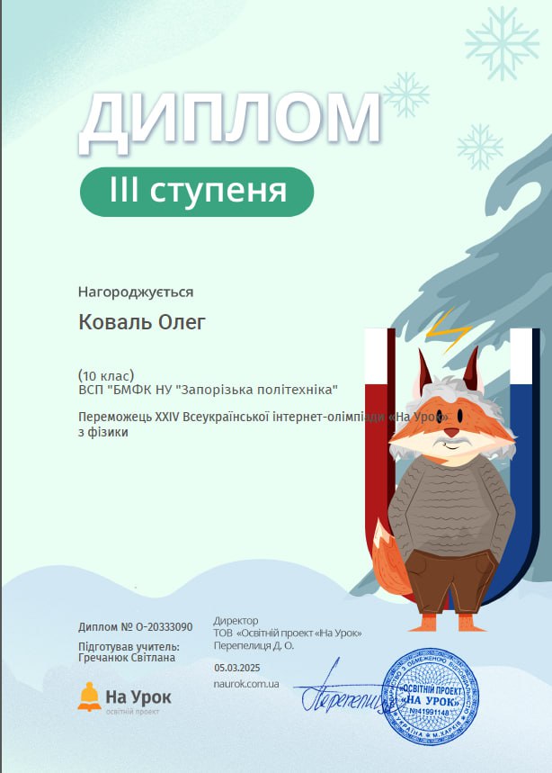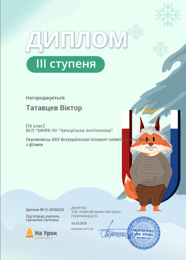 Вітаємо переможців ХХІV Всеукраїнської інтернет-олімпіади «На Урок» з фізики Віктора Татавцева і Олега Коваля та викладачку, яка їх підготувала – Гречанюк Світлану. Тож – до нових вершин та перемог!