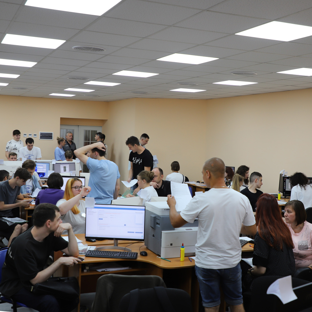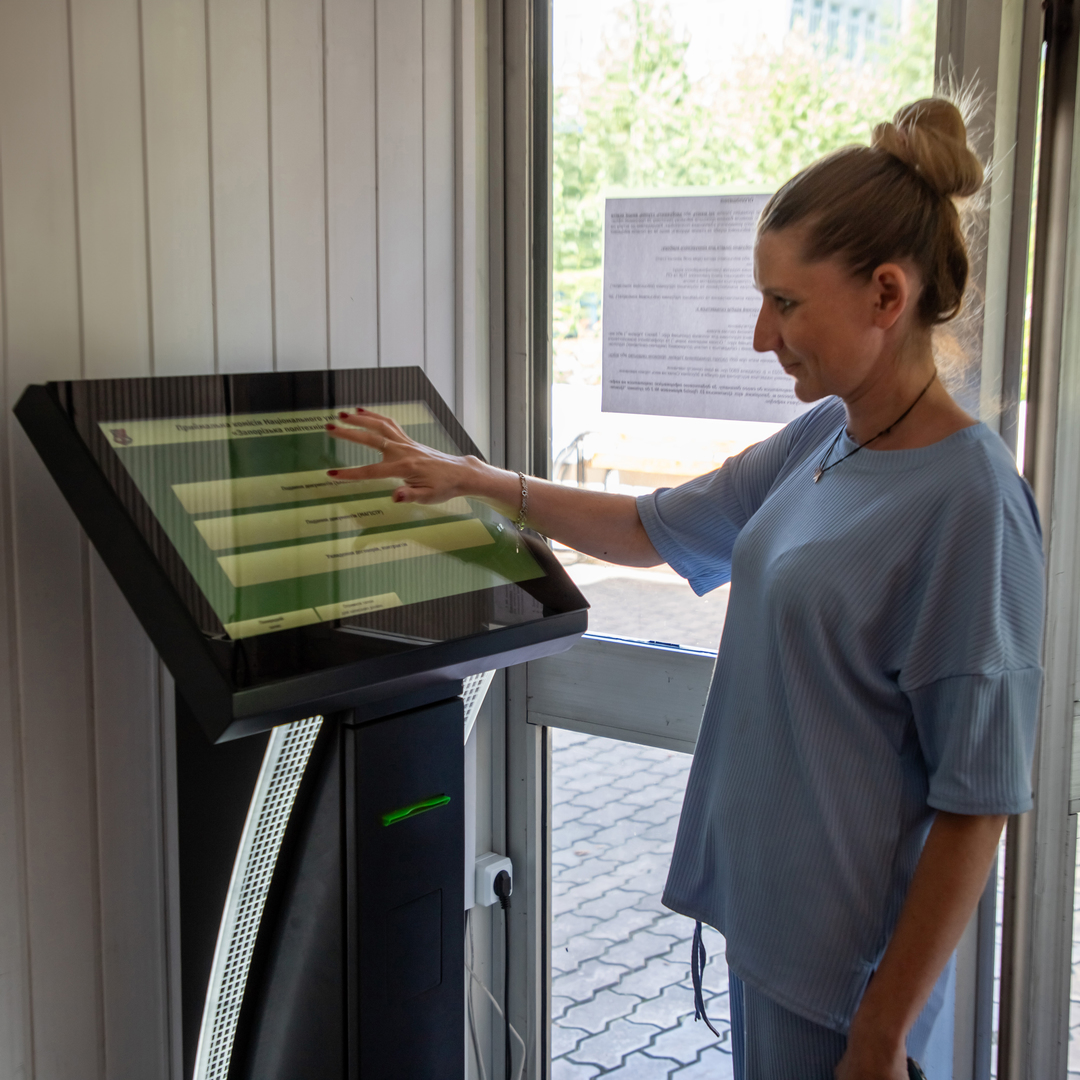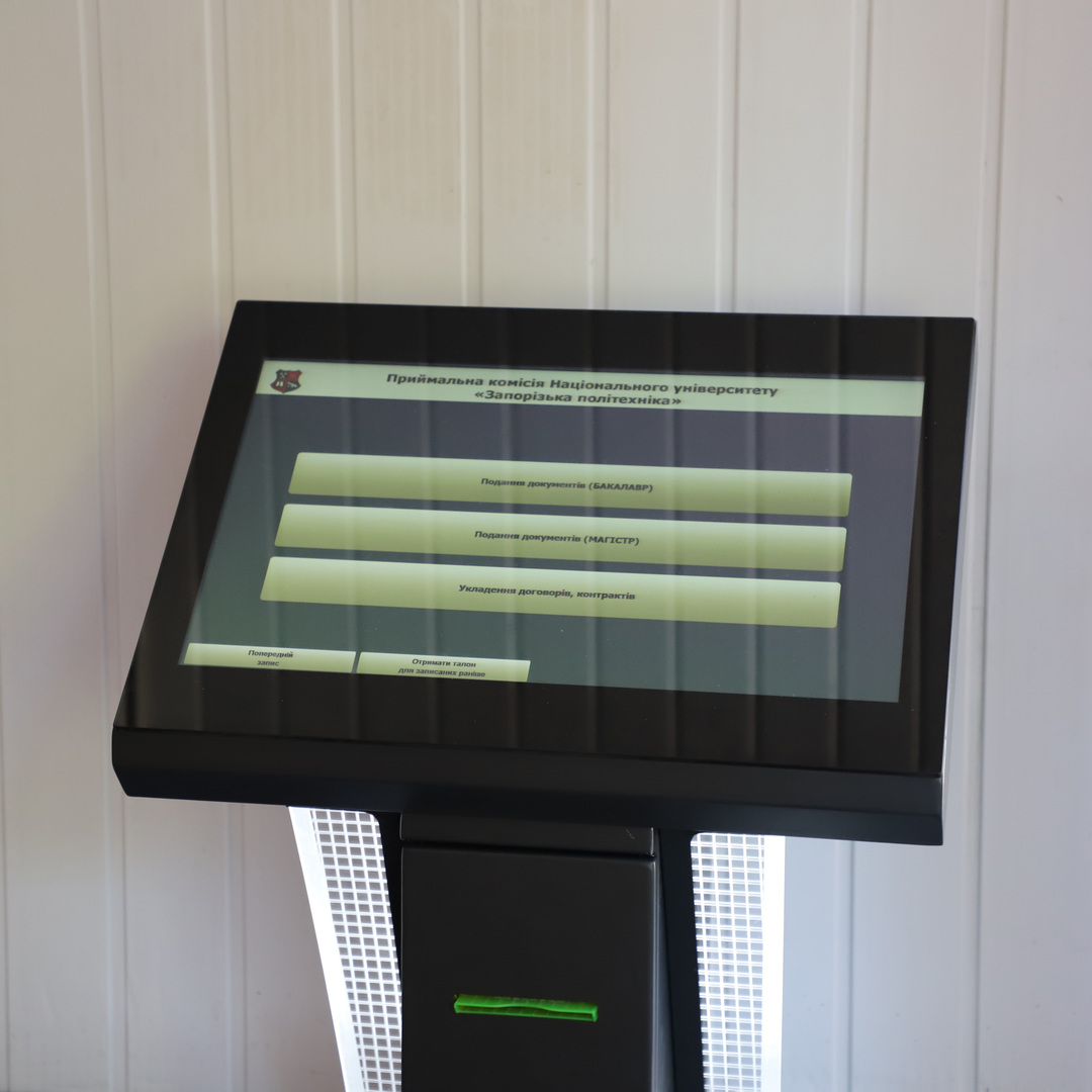 1. Отримай талон з індивідуальним номером через спеціальний термінал на вході до Приймальної комісії. Не хвилюйся, ти все зробиш правильно! По-перше, ти вже точно використовував подібну систему при отриманні паспорта або водійського посвідчення. По-друге, у нас чергує консультант, який допоможе тобі з будь-яким питанням.