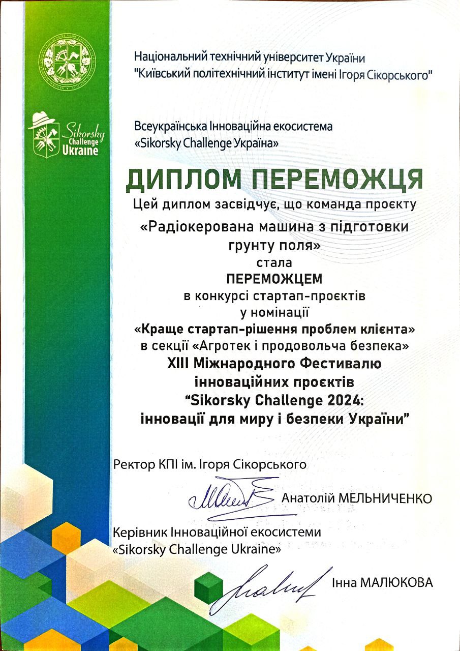 На урочистій церемонії закриття фестивалю команда проєкту «Радіокерована машина з підготовки ґрунту поля» оголошена переможцем у конкурсі стартап-проєктів у номінації «Краще стартап-рішення проблем клієнта» в секції «Агротек і продовольча безпека»!