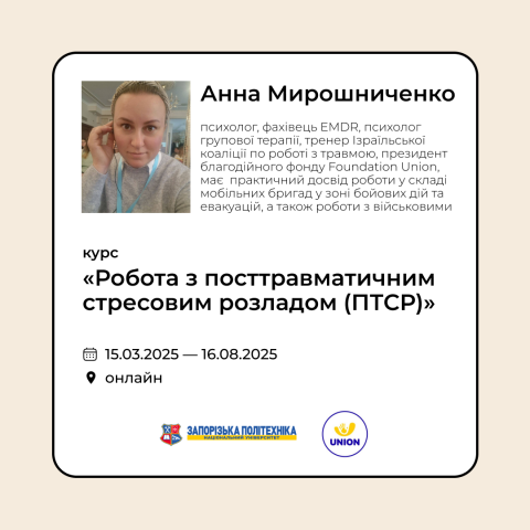 Курс «Робота з посттравматичним стресовим розладом (ПТСР)» — це програма, що поєднує сучасні дослідження, перевірені кризові протоколи та інноваційні підходи до роботи з ПТСР. Особливий акцент зроблено на зв'язку «розум-тіло», що дозволяє учасникам глибше зрозуміти вплив травматичних подій на всі аспекти психіки й фізіології.