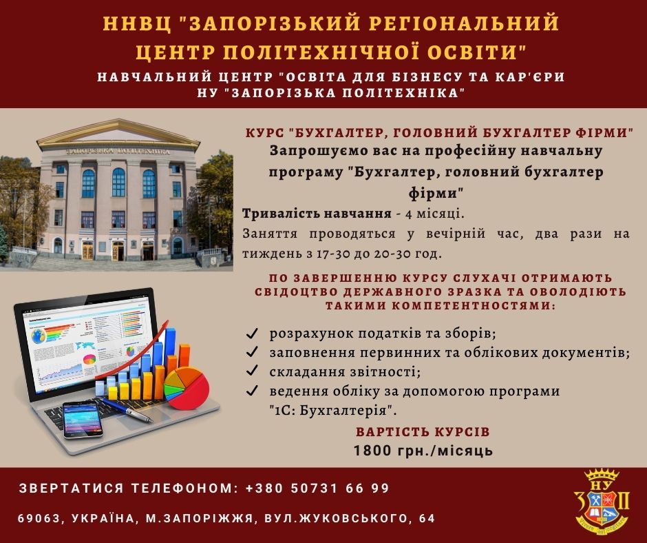 Навчальний центр «Освіта для бізнесу та кар'єри» НУ «Запорізька політехніка» запрошує на професійну навчальну програму «Бухгалтер, головний бухгалтер фірми»