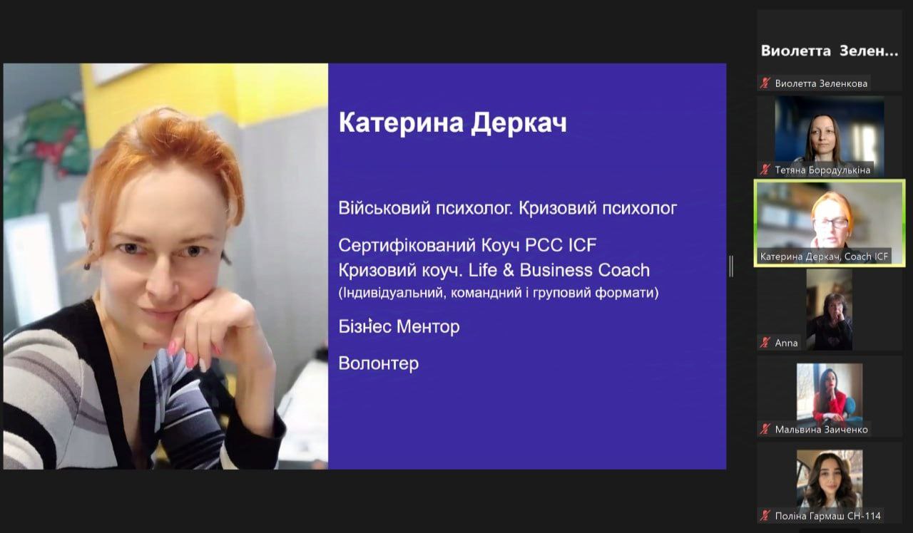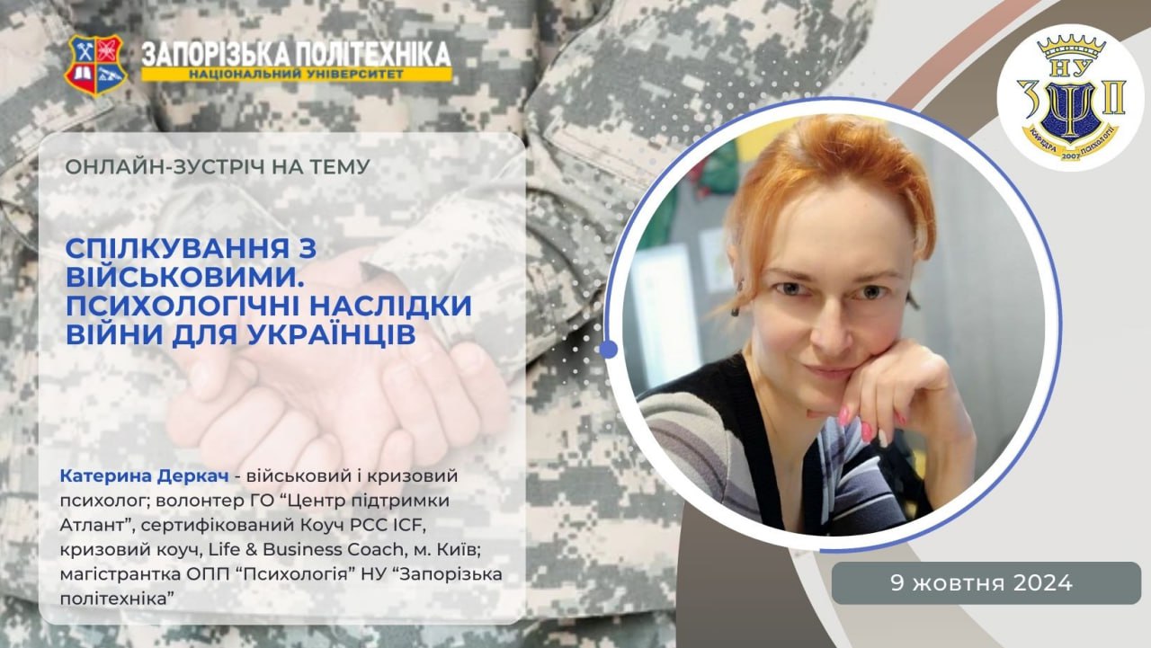 9 жовтня кафедра психології факультету соціальних наук НУ «Запорізька політехніка» організувала проведення онлайн-зустрічі на тему «Спілкування з військовими. Психологічні наслідки війни для українців». Запрошена спікерка – Катерина Деркач – військова і кризова психологиня; волонтерка ГО «Центр підтримки Атлант», сертифікована коучиня PCC ICF, кризова коучиня, Life & Business Coach (м. Київ), яка працює з військовими, ветеранами та членами їх родин.