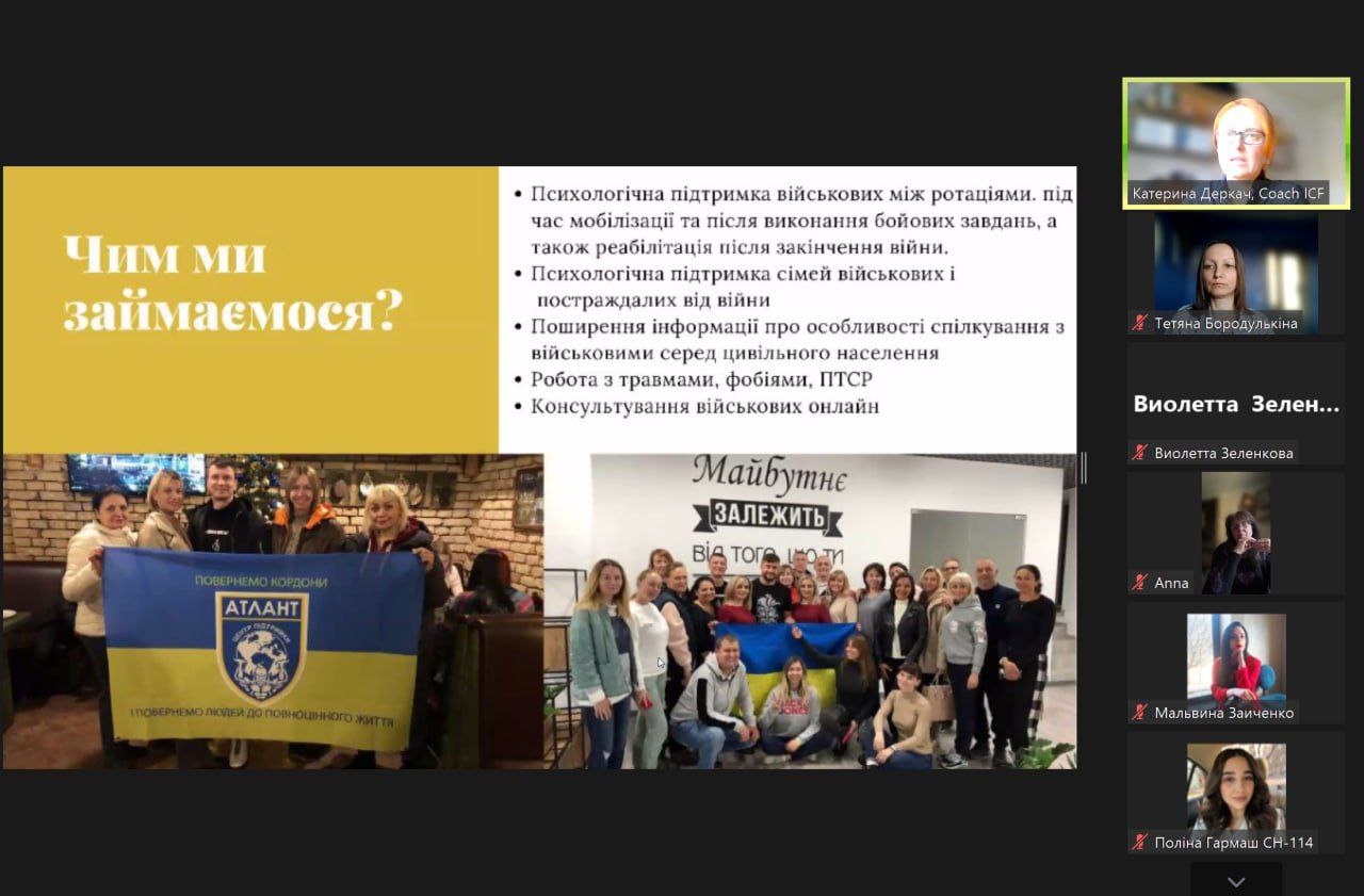 Під час зустрічі учасники обговорили, як зрозуміти військових, як їх підтримувати, як війна впливає на тих, хто знаходиться в Україні в умовах постійних загроз і що з цим робити, а також розглянули деякі психологічні та коучингові підходи в роботі з військовими.