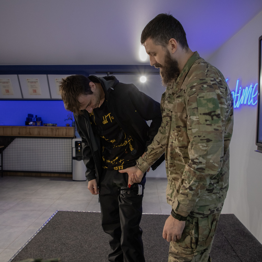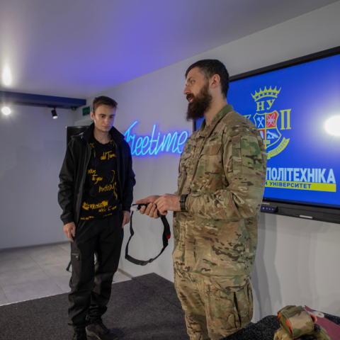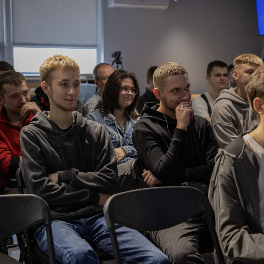 Руслан підготував для студентів та молоді комбінату інтерактивну частину про основи тактики на полі бою. Він також поділився надважливими знаннями сьогодення — надав актуальні рекомендації з тактичної медицини та навіть продемонстрував деякі практичні методи, що зможуть врятувати життя.