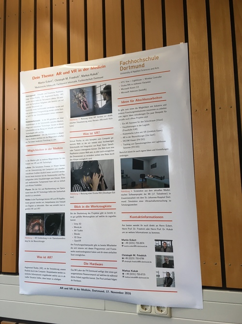19 листопада Факультет Інформатики Університету прикладних наук (FH Dortmund) проводив презентації наукових розробок. Керівники проектів провели презентації своїх робіт для студентів, що бажають приєднатись до наукової діяльності, після чого можна було детально ознайомитися з досягнутими результатами на виставці робіт. Більшість наукових розробок проводиться за підтримки промисловості регіону. Цьому сприяє той факт, що отримати посаду професора в Університеті прикладних наук можливо тільки, якщо здобувач має стаж роботи не менше 3 років на підприємстві.