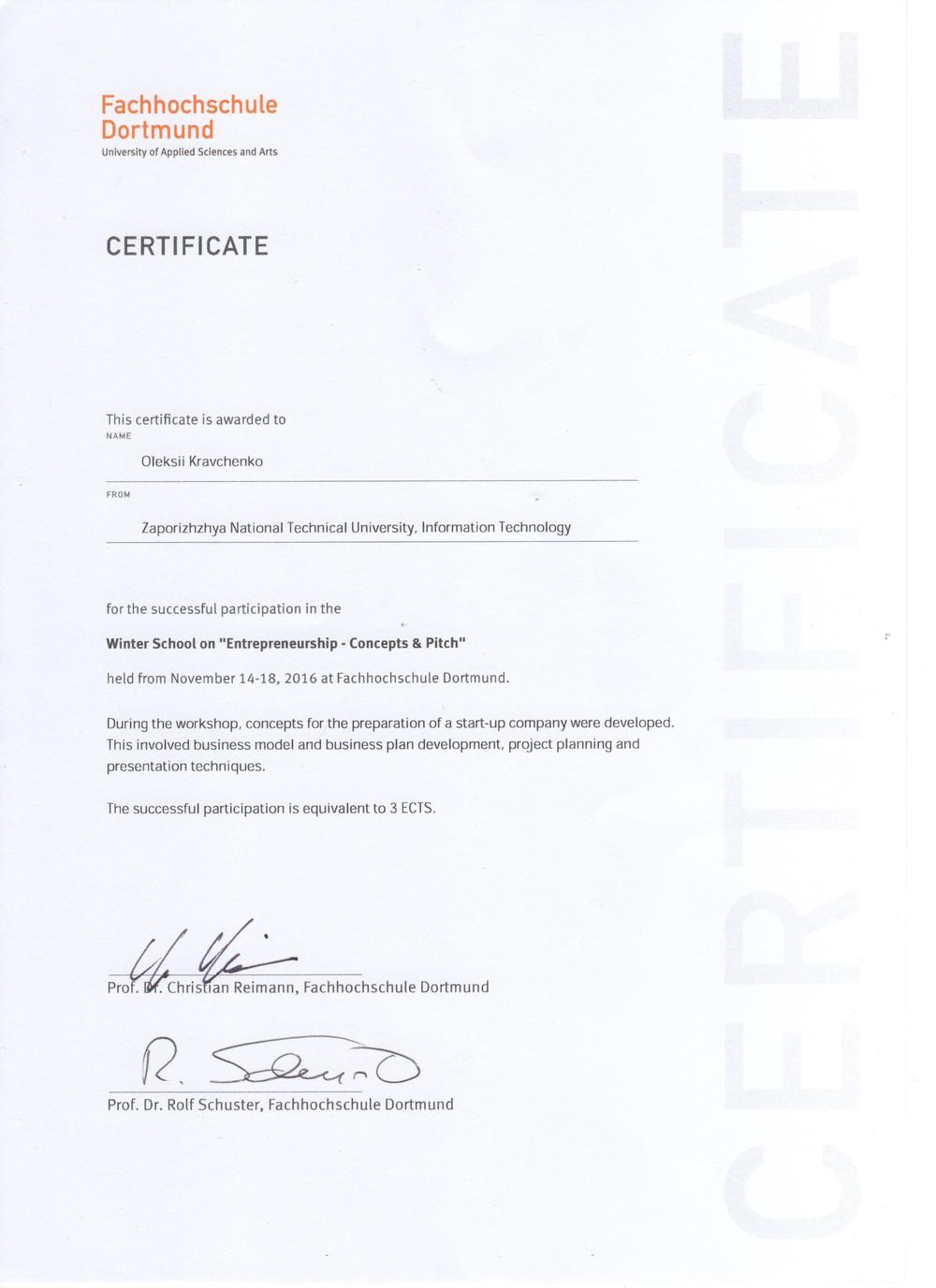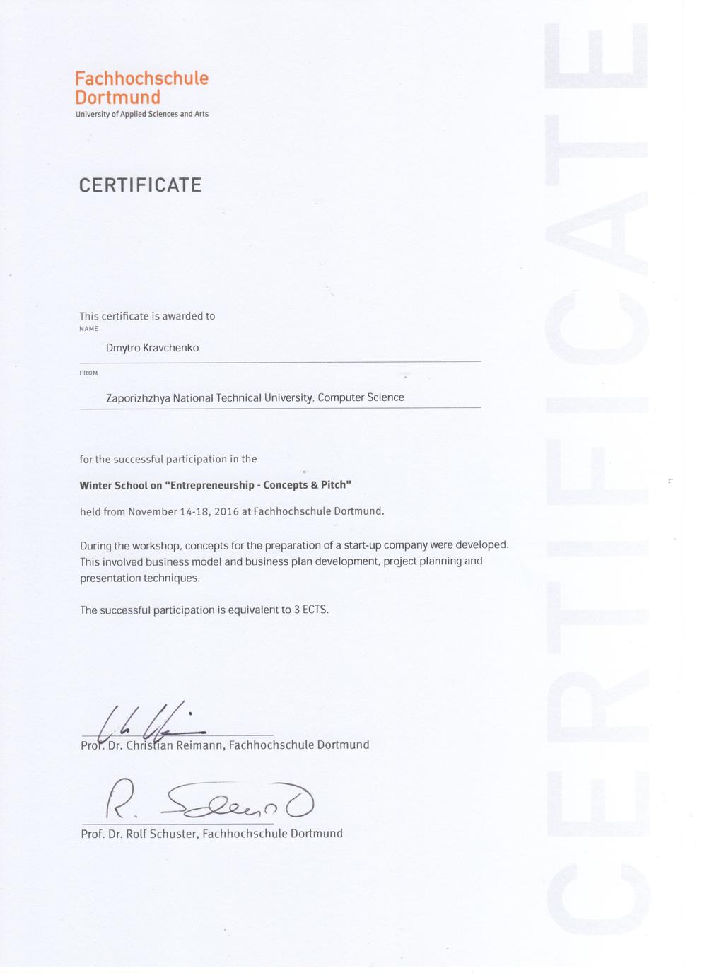 Студенти інституту радіоелектроніки та інформатики взяли участь у Зимовій школі, що проходила з 14 по 19 листопада в Університеті прикладних наук м. Дортмунд (FH Dortmund), Німеччина, за рахунок коштів проекту EuroPM. Вже другий раз наші студенти мають можливість пройти блочне навчання на кафедрі Інформатики разом зі студентами із Німеччини, Литви, Іспанії, Індії, Китаю, Росії та інших країн. Цього разу від ЗНТУ мали можливість навчатися Поліна ШИНКАРЕНКО (гр.КНТ-422м), Олексій КРАВЧЕНКО (гр. КНТ-712м), Дмитро КРАВЧЕНКО (гр.НТ-712м) та Станіслав СІРИЙ (гр.КНТ-622м).